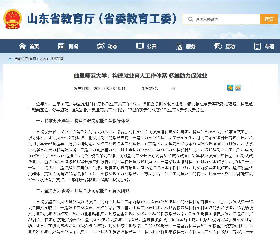 近年来,曲阜师范大学立足新时代高校就业育人工作要求,紧扣立德树人根本任务,着力推进创新实践路径建设,构建起“靶向定位、分类施教、全程护航”就业育人工作体系,积极探索新时代高校就业育人新模式新路径。
