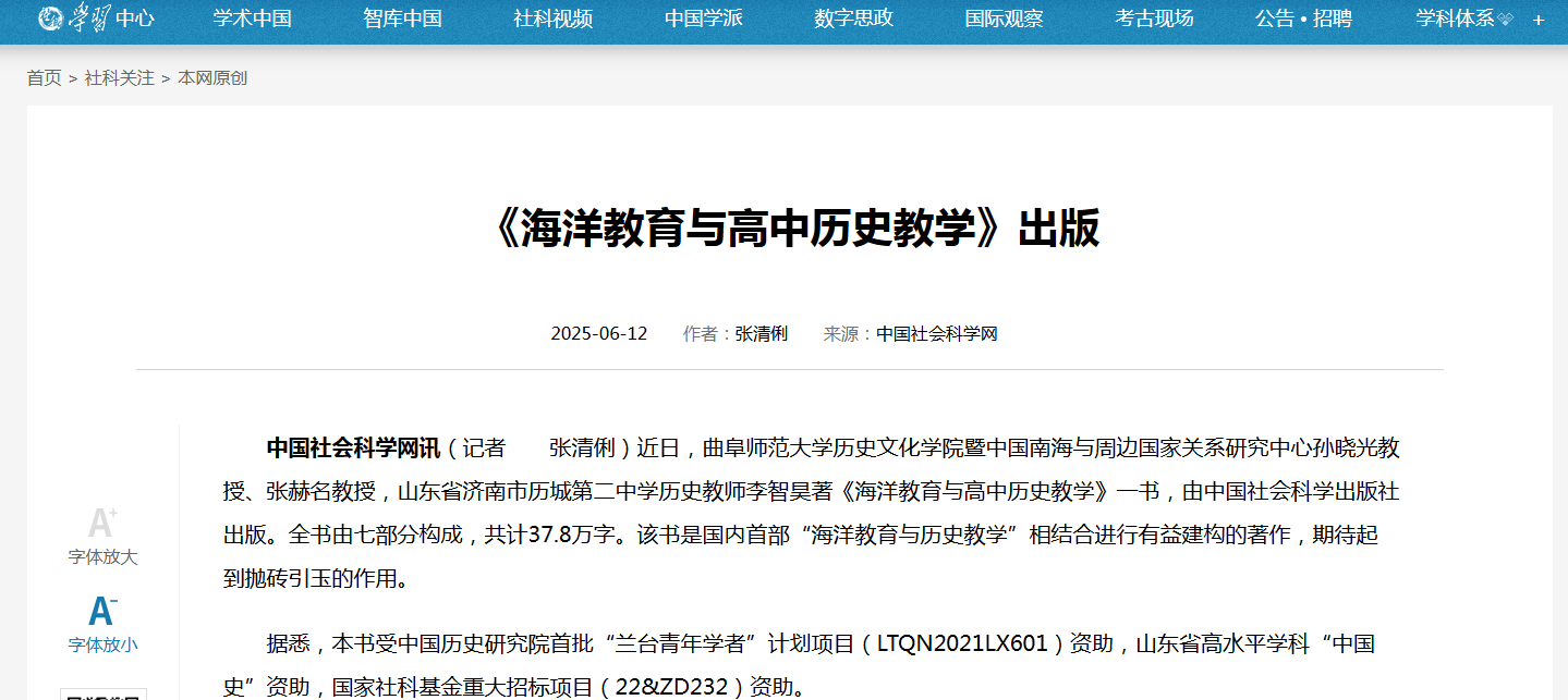 中国社会科学网讯(记者 张清俐)近日,曲阜师范大学历史文化学院暨中国南海与周边国家关系研究中心孙晓光教授、张赫名教授,山东省济南市历城第二中学历史教师李智昊著《海洋教育与高中历史教学》一书,由中国社会科学出版社出版。全书由七部分构成,共计37.8万字。该书是国内首部“海洋教育与历史教学”相结合进行有益建构的著作,期待起到抛砖引玉的作用。
