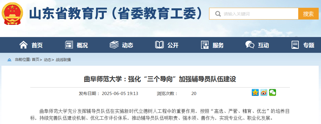 曲阜师范大学充分发挥辅导员队伍在实施新时代立德树人工程中的重要作用,按照“高选、严管、精育、优出”的培养目标,持续完善队伍建设机制、优化工作评价体系,推动辅导员队伍明职责、强本领、善作为,实现专业化、职业化发展。