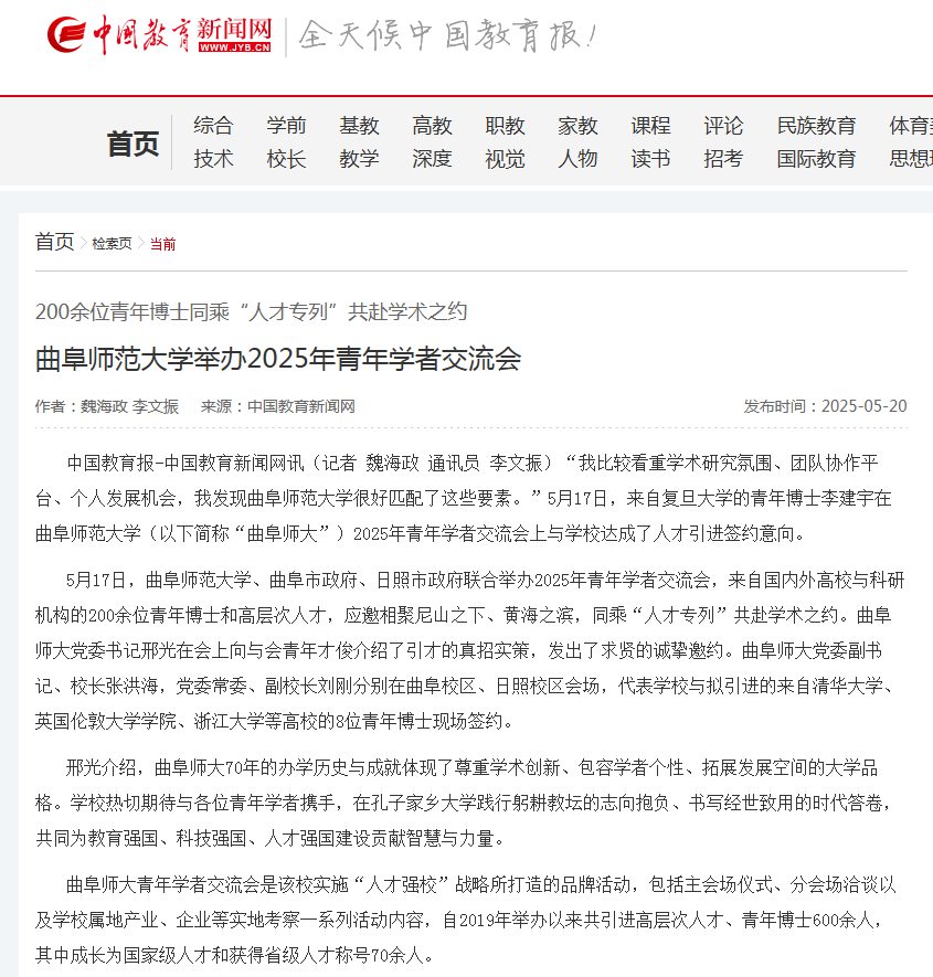 中国教育报-中国教育新闻网讯(记者 魏海政 通讯员 李文振)“我比较看重学术研究氛围、团队协作平台、个人发展机会,我发现曲阜师范大学很好匹配了这些要素。”5月17日,来自复旦大学的青年博士李建宇在曲阜师范大学(以下简称“曲阜师大”)2025年青年学者交流会上与学校达成了人才引进签约意向。