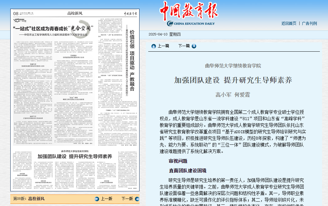 曲阜师范大学继续教育学院拥有全国第二个成人教育学专业硕士学位授权点,成人教育学是山东省一流学科建设“811”项目和山东省“高峰学科”教育学的重要组成部分。曲阜师范大学成人教育学研究生导师团队依托山东省研究生教育教学改革重点项目“基于ADDIE模型的研究生导师培训研究与实践”等项目,积极推进研究生导师队伍建设,历经8年探索,构建了“师德为先、能力为要、系统联动”的“三位一体”团队建设模式,为破解导师团队建设难题提供了系统化解决方案。