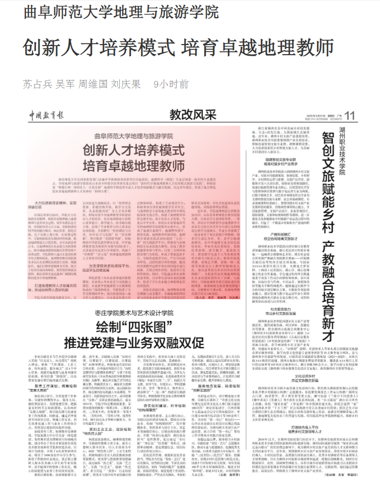 曲阜师范大学是国家教育部门卓越中学教师培养改革项目实施高校,地理科学(师范)专业是国家一流本科专业建设点。学校地理与旅游学院依托山东省本科教学改革研究重点项目“新时代卓越地理教师人才培养模式创新与实践”,积极探索“师德引领—协同育人—自我发展”地理科学师范类专业人才培养创新模式与融合机制,经过多年建设,形成了地方师范院校卓越地理教师人才培养的“曲师方案”。