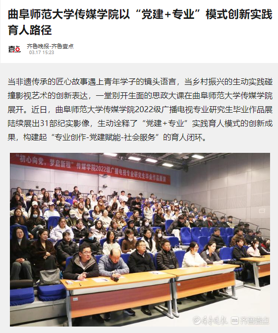 当非遗传承的匠心故事遇上青年学子的镜头语言,当乡村振兴的生动实践碰撞影视艺术的创新表达,一堂别开生面的思政大课在曲阜师范大学传媒学院展开。近日,曲阜师范大学传媒学院2022级广播电视专业研究生毕业作品展陆续展出31部纪实影像,生动诠释了“党建+专业”实践育人模式的创新成果,构建起“专业创作-党建赋能-社会服务”的育人闭环。