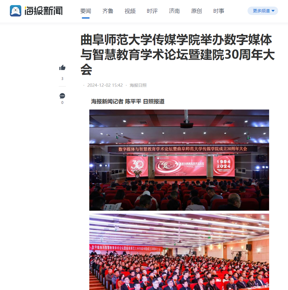 三秩春秋培英才德业并进,卅载春晖绘蓝图与世俱新。12月1日上午,曲阜师范大学传媒学院顺利举办数字媒体与智慧教育学术论坛暨建院30周年大会。