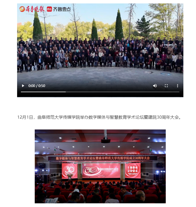 12月1日,曲阜师范大学传媒学院举办数字媒体与智慧教育学术论坛暨建院30周年大会。