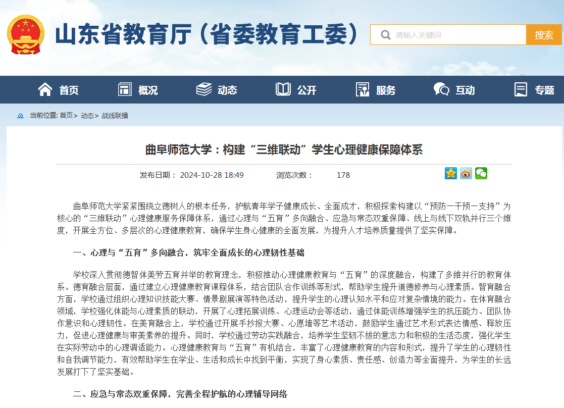 曲阜师范大学紧紧围绕立德树人的根本任务,护航青年学子健康成长、全面成才,积极探索构建以“预防—干预—支持”为核心的“三维联动”心理健康服务保障体系,通过心理与“五育”多向融合、应急与常态双重保障、线上与线下双轨并行三个维度,开展全方位、多层次的心理健康教育,确保学生身心健康的全面发展,为提升人才培养质量提供了坚实保障。