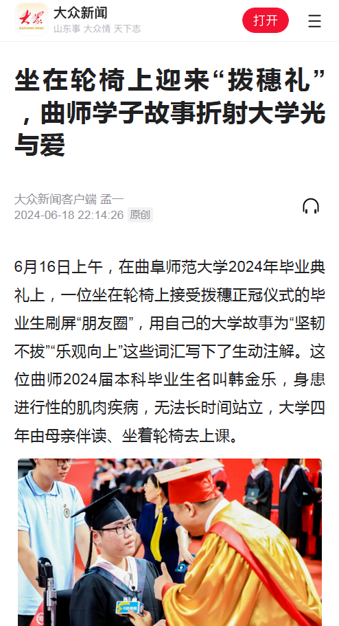 6月16日上午,在曲阜师范大学2024年毕业典礼上,一位坐在轮椅上接受拨穗正冠仪式的毕业生刷屏“朋友圈”,用自己的大学故事为“坚韧不拔”“乐观向上”这些词汇写下了生动注解。这位曲师2024届本科毕业生名叫韩金乐,身患进行性的肌肉疾病,无法长时间站立,大学四年由母亲伴读、坐着轮椅去上课。