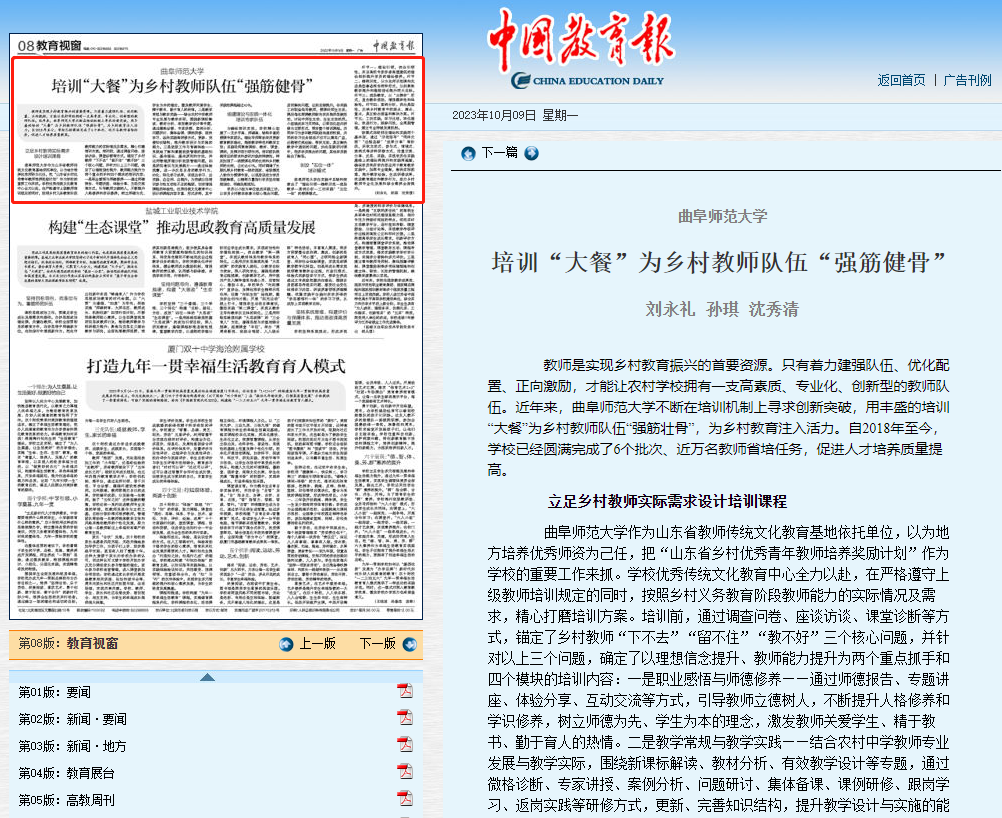 曲阜师大党委宣传部讯 日前,《中国教育报》刊发题为《曲阜师范大学培训“大餐”为乡村教师队伍“强筋健骨”》的文章。文章指出,教师是实现乡村教育振兴的首要资源。只有着力建强队伍、优化配置、正向激励,才能让农村学校拥有一支高素质、专业化、创新型的教师队伍。近年来,曲阜师范大学不断在培训机制上寻求创新突破,用丰盛的培训“大餐”为乡村教师队伍“强筋壮骨”,为乡村教育注入活力,促进了人才培养质量提高。