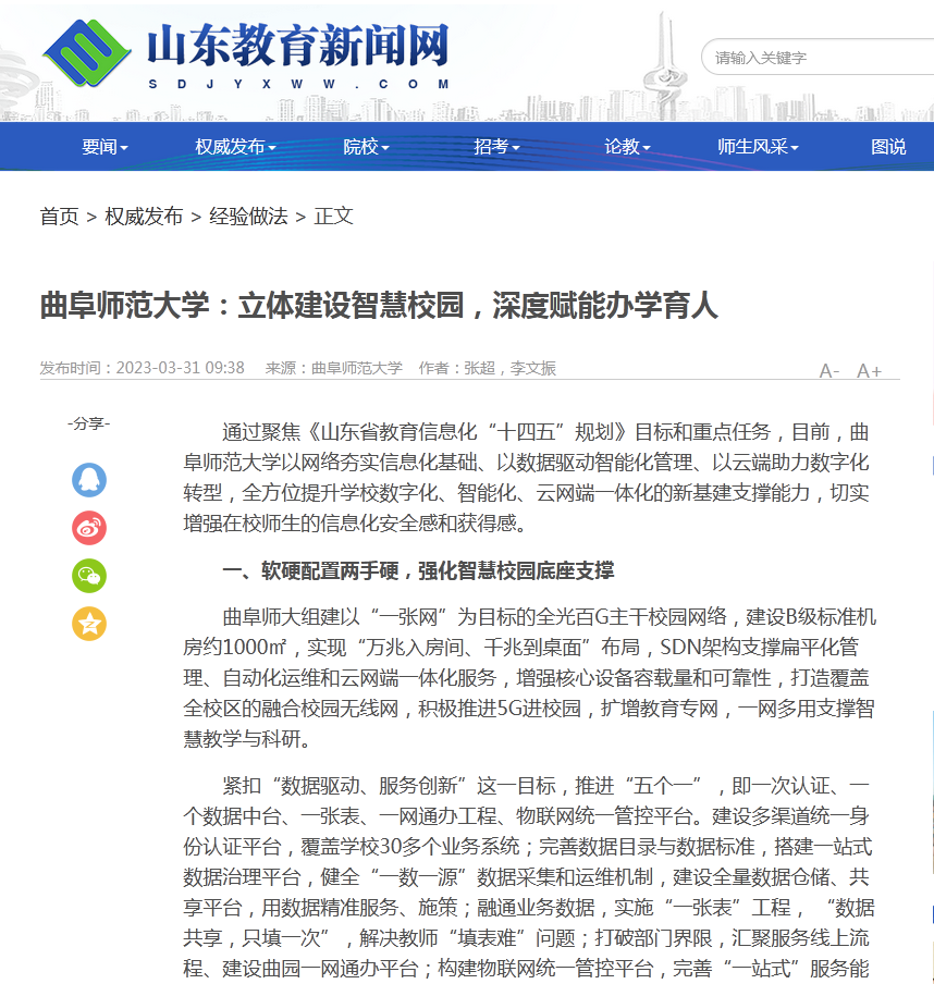 通过聚焦《山东省教育信息化“十四五”规划》目标和重点任务,目前,曲阜师范大学以网络夯实信息化基础、以数据驱动智能化管理、以云端助力数字化转型,全方位提升学校数字化、智能化、云网端一体化的新基建支撑能力,切实增强在校师生的信息化安全感和获得感。