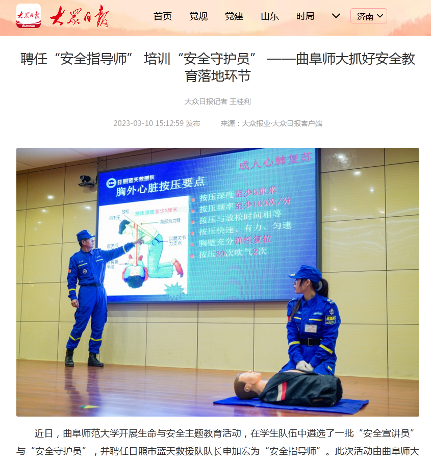 近日,曲阜师范大学开展生命与安全主题教育活动,在学生队伍中遴选了一批“安全宣讲员”与“安全守护员”,并聘任日照市蓝天救援队队长申加宏为“安全指导师”。此次活动由曲阜师大政治与公共管理学院发起,旨在进一步推动青年学子把安全防范意识和自我保护能力记在心中、带进行动、融入日常、落到实处。