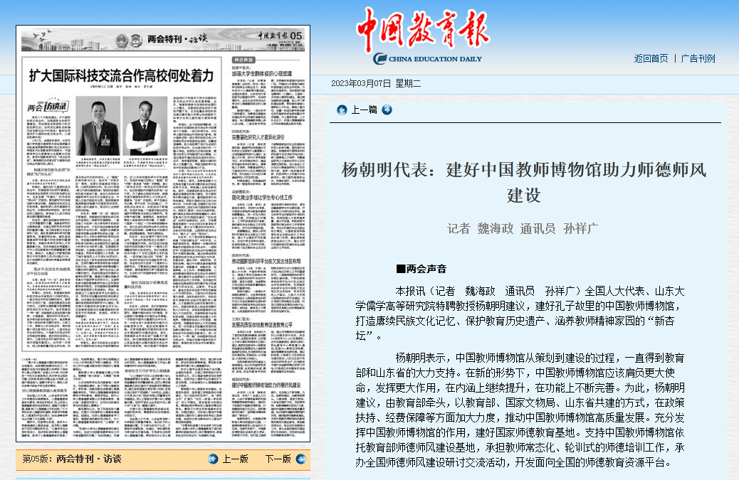 本报讯(记者 魏海政 通讯员 孙祥广)全国人大代表、山东大学儒学高等研究院特聘教授杨朝明建议,建好孔子故里的教师博物馆,打造赓续民族文化记忆、保护教育历史遗产、涵养教师精神家园的“新杏坛”。