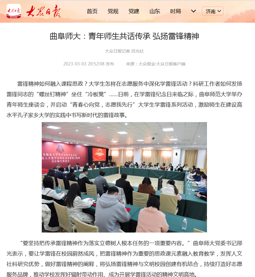 雷锋精神如何融入课程思政?大学生怎样在志愿服务中深化学雷锋活动?科研工作者如何发扬雷锋同志的“螺丝钉精神”坐住“冷板凳”……日前,在学雷锋纪念日来临之际,曲阜师范大学举办青年师生座谈会,并启动“青春心向党,志愿我先行”大学生学雷锋系列活动,激励师生在建设高水平孔子家乡大学的实践中书写新时代的雷锋故事。
