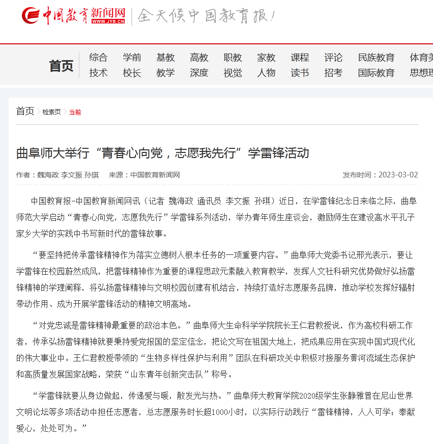 近日,在学雷锋纪念日来临之际,曲阜师范大学启动“青春心向党,志愿我先行”学雷锋系列活动,举办青年师生座谈会,激励师生在建设高水平孔子家乡大学的实践中书写新时代的雷锋故事。