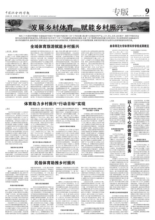 曲阜师大体育科学学院讯 日前,中国社会科学报在“发展乡村体育、赋能乡村振兴”专版中刊登了曲阜师范大学山东省乡村振兴体育研究院执行副院长曹莉教授团队的系列成果,其内容包括:体育助力乡村振兴“行动目标”、构建以人民为中心的体育公共服务、全域体育旅游赋能乡村振兴、民俗体育助推乡村振兴等主题的阶段性战略研究。报道还对学校体育科学学院近年来取得的相关成绩进行了列举,相关科研成果为全国农村体育发展提供理论依据和现实借鉴,标志着团队的研究在乡村体育领域处于省内领先地位、对全国乡村体育研究形成较大影响。