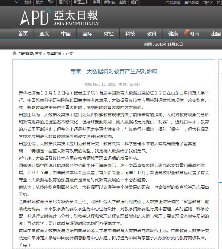 下一篇:中国新闻网:“大数据驱动的教育变革”国际研讨会在曲阜举行