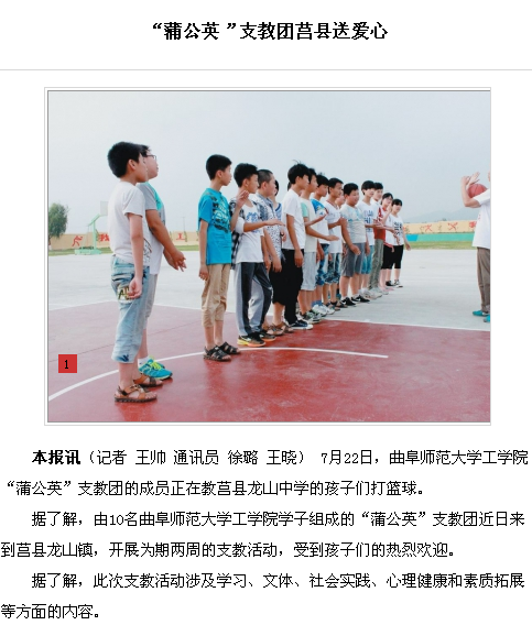 大众网链接:曲阜师范大学“蒲公英”支教团牵手莒县龙山中学http://rizhao.dzwww.com/xy/201507/t20150724_12757099.html