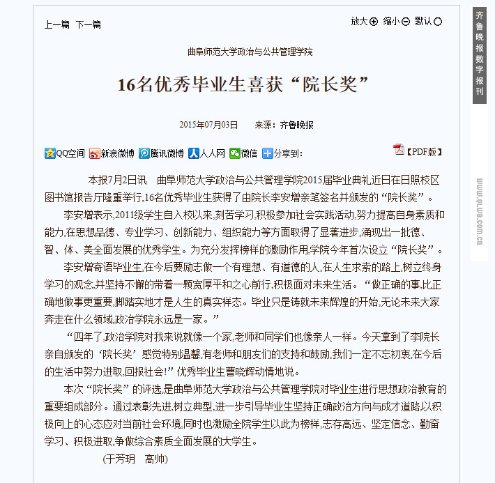 齐鲁晚报:曲阜师范大学政治与公共管理学院16名优秀毕业生喜获“院长奖”