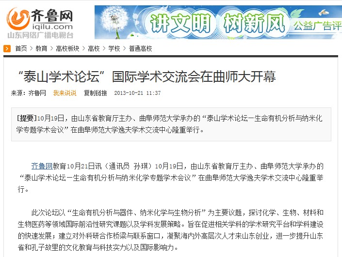 上一篇:山东教育电视台:“泰山学术论坛——生命有机分析与纳米化学专题”国际学术交流会在曲阜师大举行